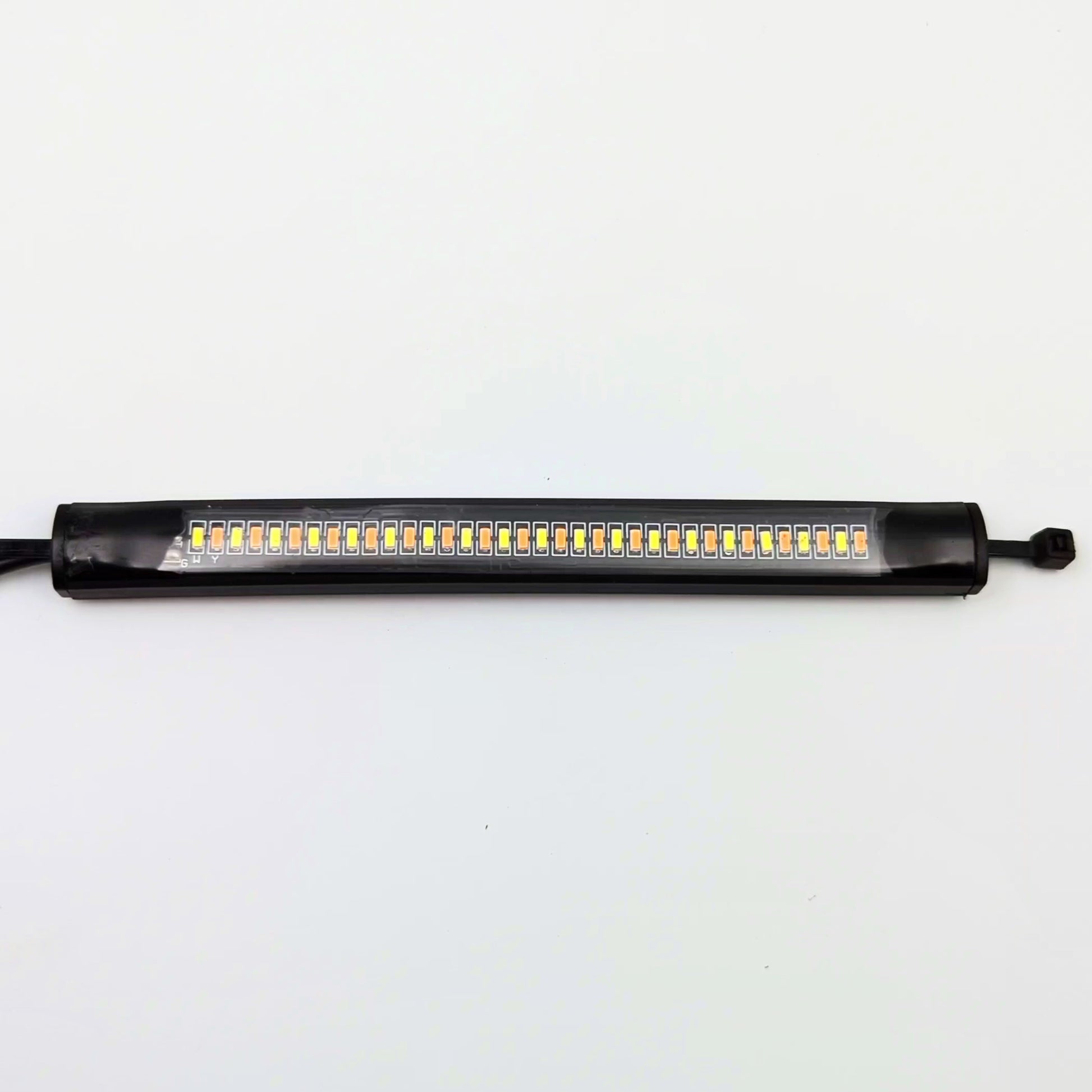 Bright amber LEDs that sequence outward when in turn signal mode, and bright white LEDs when in drive light mode